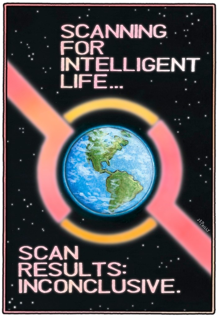 The idea that aliens many lightyears away are watching I Love Lucy, The Brady Bunch, or The Dick Van Dyke Show is probably false.  As radio/television broadcasts propagate through space, those signals grow weaker and eventually blend into the background radiation.  But for the purposes of this blog post, we’re imagining that an alien spaceship is right here in the Solar System with us.  They’re close enough to pick up our broadcasts.  At that point, the aliens wouldn’t just think, “Huh, weird.”  They’d be forced to conclude not only that life exists on Earth but that intelligent life exists on Earth (unless they start watching our news or listening to our talk radio; if they do that, they might second guess the “intelligent” part).