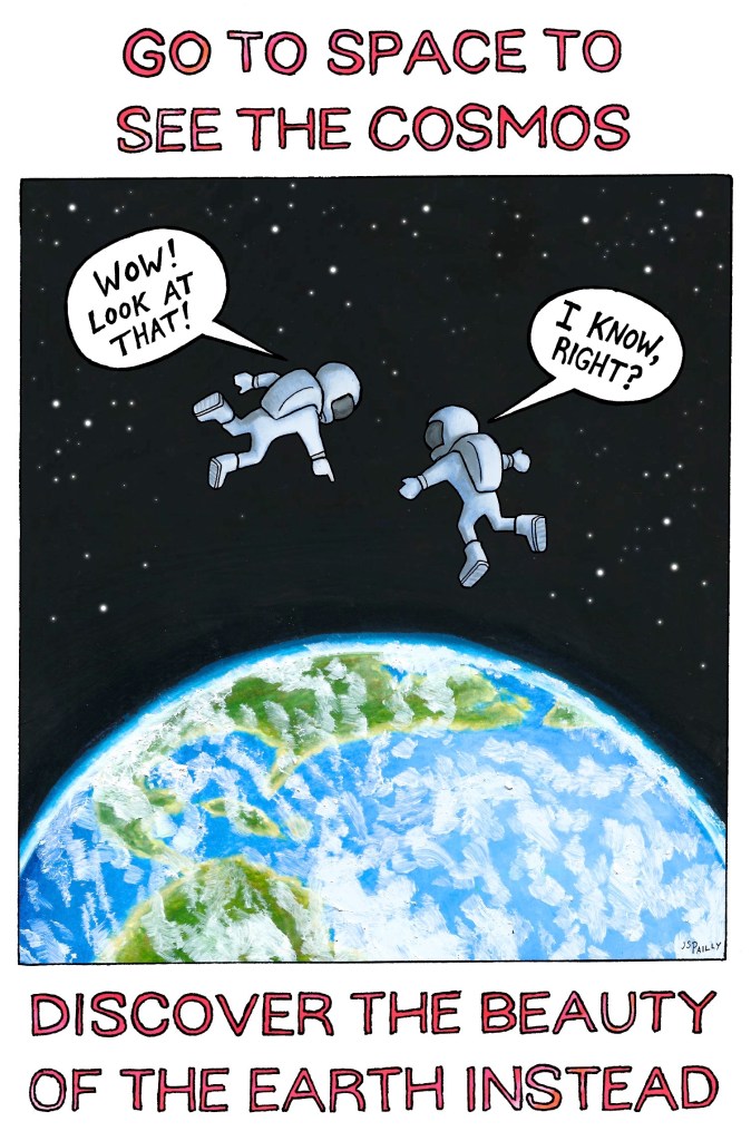 As the aliens draw nearer, they’d soon notice this odd green stuff covering much of Earth’s landmasses. To say that in a more technobabbly way, the extraterrestrials would detect a chemical substance with a strong reflection spectrum in green light (and an even stronger reflection spectrum in infrared). You and I know what all that green stuff is, but would the aliens figure it out? Do they have plants back home? Do their plants contain chlorophyll and perform photosynthesis like ours do? Hard to say, but Earth’s green stuff would at least make the aliens think, “Huh, that’s also weird.”